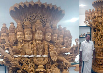 Read moreDetailsതിരുവനന്തപുരം: അനന്തപുരിയില് വിഷ്ണുഭഗവാന്റെ വിശ്വരൂപം തീര്ത്ത് തന്റെ കരവിരുത് തെളിയിച്ചിരിക്കുകയാണ് തിരുവനന്തപുരം വെള്ളാര് സ്വദേശി ശില്പി ആര്.നാഗപ്പന്. കുമ്പിള് തടിയാണ് രൂപകല്പനയ്ക്കായി ഉപയോഗിച്ചിട്ടുള്ളത്. ചിത്രകാരന്മാരുടെ വിശ്വരൂപഭാവനയില് നിന്നും...