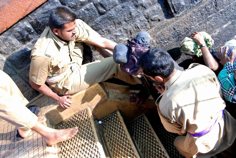 ശബരിമല: പമ്പമുതല് സന്നിധാനം വരെ അയ്യപ്പഭക്തര്ക്ക് തുണയേകാന് കേരളപോലീസ് ഇമ ചിമ്മാതെ കാവലുണ്ട്. പതിനെട്ടാം പടിയില് ഭക്തരെ കൈപിടിച്ച് കയറ്റുന്നതും കേരളപോലീസിന്റെ ചുമതലയാണ്. ശബരിമല ഡ്യൂട്ടിയില് ഏറെ ശ്രമകരവും അവിശ്രമവുമായ ജോലിയാണ് പതിനെട്ടാം പടിയിലേത്. ദിവസം 90 പേരെയാണ് പതിനെട്ടാം പടിയില് ഡ്യൂട്ടിക്ക് നിയോഗിച്ചിട്ടുള്ളത്. 30 പേര് വീതമുള്ള മൂന്ന് ഗ്രൂപ്പായി ഷിഫ്റ്റ് സമ്പ്രദായത്തിലാണ് ഡ്യൂട്ടി. 4 മണിക്കൂര് ഊഴം വെച്ച് ഷിഫ്റ്റ് മാറും. 30 പേരുള്ള ഓരോ സംഘവും പതിനഞ്ചു പേര് വീതം വിഭജിച്ചു ഇരുപതു മിനിട്ട് വീതമാണ് ഓരോ ഷിഫ്റ്റിലും സേവനം ചെയ്യുക. ഇത്തരത്തില് മുപ്പതു പേരുള്ള സംഘം രണ്ടായി തിരിഞ്ഞാണ് പതിനെട്ടാം പടിയില് നില്ക്കുന്നത്. പതിനെട്ടാം പടിയിലെ സേവനം അനുഷ്ഠിക്കുന്ന എ ഗ്രൂപ്പ് വിഭാഗം തിരുവനന്തപുരം എസ്.എ.പി. യില് നിന്നുള്ള പോലീസ് ഉദേ്യാഗസ്ഥര് ആണ്. ബി വിഭാഗത്തില് തൃശ്ശൂര് കെ എ പി ഫസ്റ്റ് ബറ്റാലിയനും സി വിഭാഗത്തില് കണ്ണൂര് കെ എ പി നാലാം ബറ്റാലിയനും നിലവില് സേവനം അനുഷ്ഠിക്കുന്നു. നിലവില് ഒരു മിനിറ്റില് നൂറോളം ഭക്തജനങ്ങളെ പതിനെട്ടാം പടി കയറാന് പോലീസ് അയ്യപ്പന്മാര് സഹായിക്കുന്നുണ്ട്. കണ്ണൂര് കെ എ പി നാലാം ബറ്റാലിയന് അസിസ്റ്റന്റ് കമാന്ഡന്റ് ടി പി ശ്യാം സുന്ദറിനാണ് പതിനെട്ടാം പടിയിലെ പോലീസ് സേവനങ്ങള് ഏകോപിപ്പിക്കാനുള്ള ചുമതല.