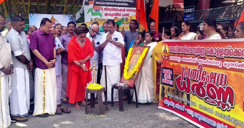 തിരുവനന്തപുരം: വിശ്വഹിന്ദു പരിഷത്തിന്റെയും കേരള ക്ഷേത്രസംരക്ഷണ സമിതിയുടെയും സംയുക്താഭിമുഖ്യത്തില് ശബരിമലയിലെ സ്വര്ണ്ണ കൊള്ളയ്ക്കെതിരെ തിരുവനന്തപുരം നന്ദന്കോട് ദേവസ്വം ബോര്ഡ് ആസ്ഥാനത്ത് പ്രതിഷേധ ധര്ണ്ണ ഉദ്ഘാടനം ശ്രീരാമാദാസമിഷന് അധ്യക്ഷന് ശ്രീശക്തി ശാന്താനന്ദ മഹര്ഷി ഭദ്രദീപം തെളിച്ച് നിര്വഹിച്ചു. കേരള ക്ഷേത്രസംരക്ഷണ സമിതി സംസ്ഥാന ഉപാധ്യക്ഷന് ജി.കെ.സുരേഷ് ബാബുവിന്റെ അധ്യക്ഷതയില് ചേര്ന്ന യോഗത്തില് വി.എച്ച്.പി സംസ്ഥാന സംഘടനാ സെക്രട്ടറി വി.ആര്.രാജശേഖരന്, വി.എച്ച്.പി.സംസ്ഥാന സേവാപ്രമുഖ് സി.ബാബുക്കുട്ടന്, സംസ്ഥാന പ്രചാര് പ്രമുഖ് ഷാജു വേണുഗോപാല്, വി.എച്ച്.പി സംഘടനാ സെക്രട്ടറി അജിത് കുമാര്, സമിതി മേഖലാ സെക്രട്ടറി ഭുവനചന്ദ്രന് തുടങ്ങിയവര് സംസാരിച്ചു.