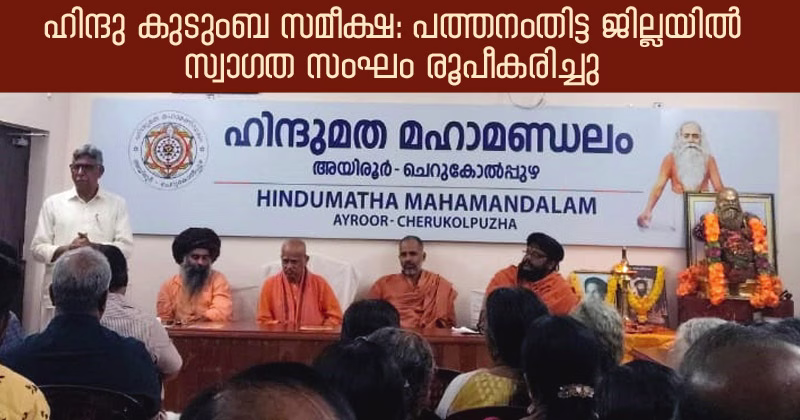 ശ്രീരാമദാസമിഷന് പ്രസ്ഥാനങ്ങളുടെ നേതൃത്വത്തില് 2026 ജനുവരിയില് നടക്കുന്ന ഹിന്ദു കുടുംബ സമീക്ഷയുടെ പത്തനംതിട്ട ജില്ലാ സ്വാഗതസംഘ രൂപീകരണം 2025 ഡിസംബര് 12ന് അയിരൂര് ചെറുകൊല്പ്പുഴ വിദ്യാധിരാജ മന്ദിരത്തില് വെച്ച് നടന്നു.